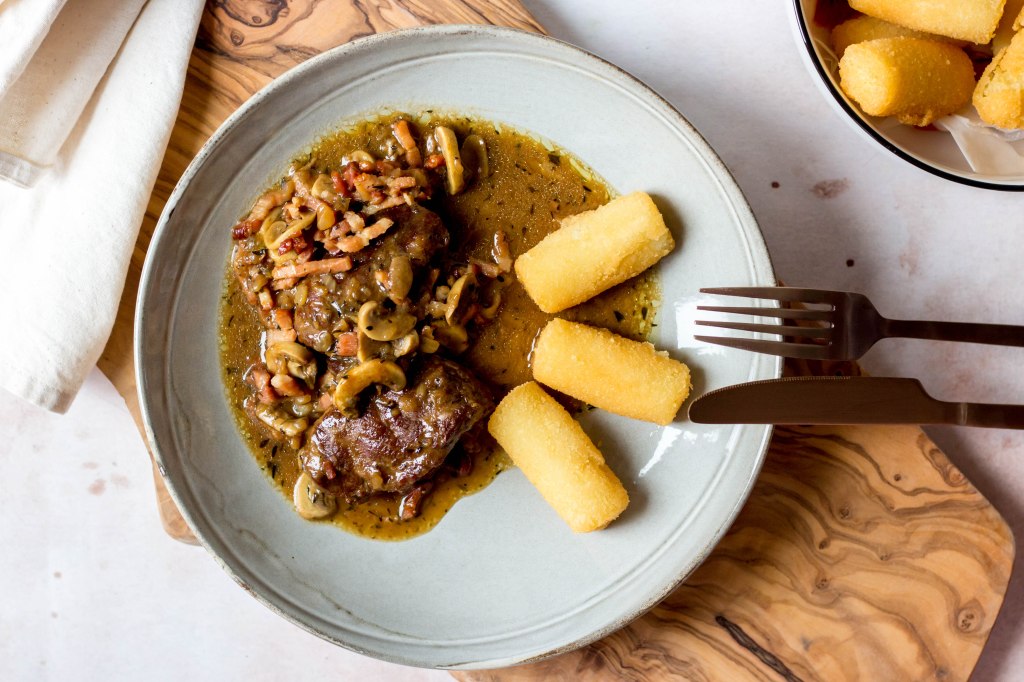 Verdeel het vlees met de saus over de borden. Lekker met kroketjes, frietjes of puree.