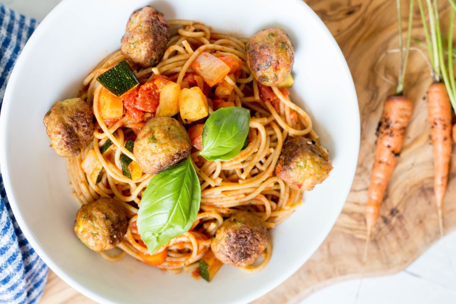 Spaghetti in tomatensaus met heel veel groentjes… super lekker! Iedereen kent de klassieker ‘spaghetti met gehaktballetjes’ wel maar deze keer koos ik voor groenteballetjes, even lekker! En dat met een extra toevoeging van wortelen en courgette uit de moestuin 😉