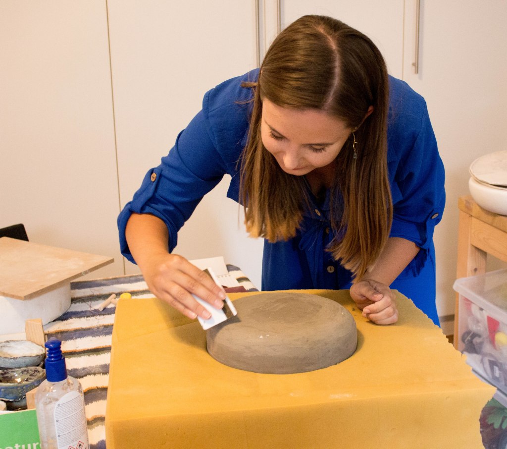 Zoals je op de foto kan zien, duw en verspreid je de klei voorzichtig in de gipsmal. Wanneer de klei droog is haal je deze voorzichtig uit de mal en werk je de scheurtjes aan de onderkant weg.