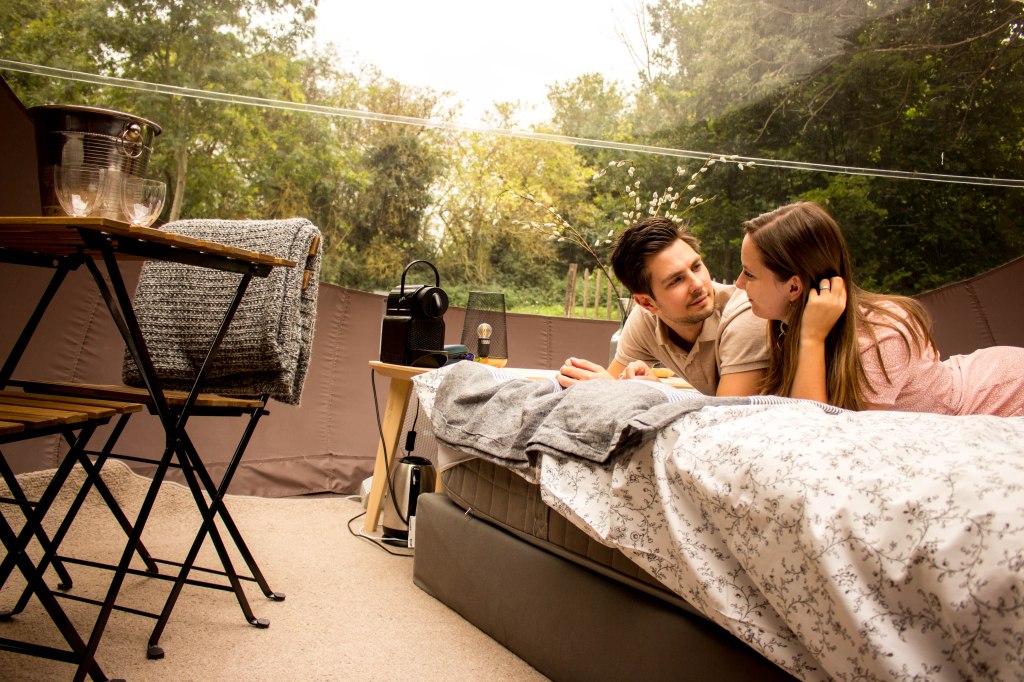 Je denkt misschien, is er wel genoeg privacy? Ja hoor! Het zicht naar buiten toe bevindt achteraan de bubbel. De bubbel zit wat verstopt tussen struiken en bomen. De ingang bevindt zich langs de voorkant en is bedekt. Je kan de bubbel een beetje vergelijken met een luchtkasteel. Door een luchtpomp blijft het geheel recht. De pomp hoor je een heel klein beetje maar is absoluut niet storend. De geluiden van de natuur overheersen het kleine gesuis.