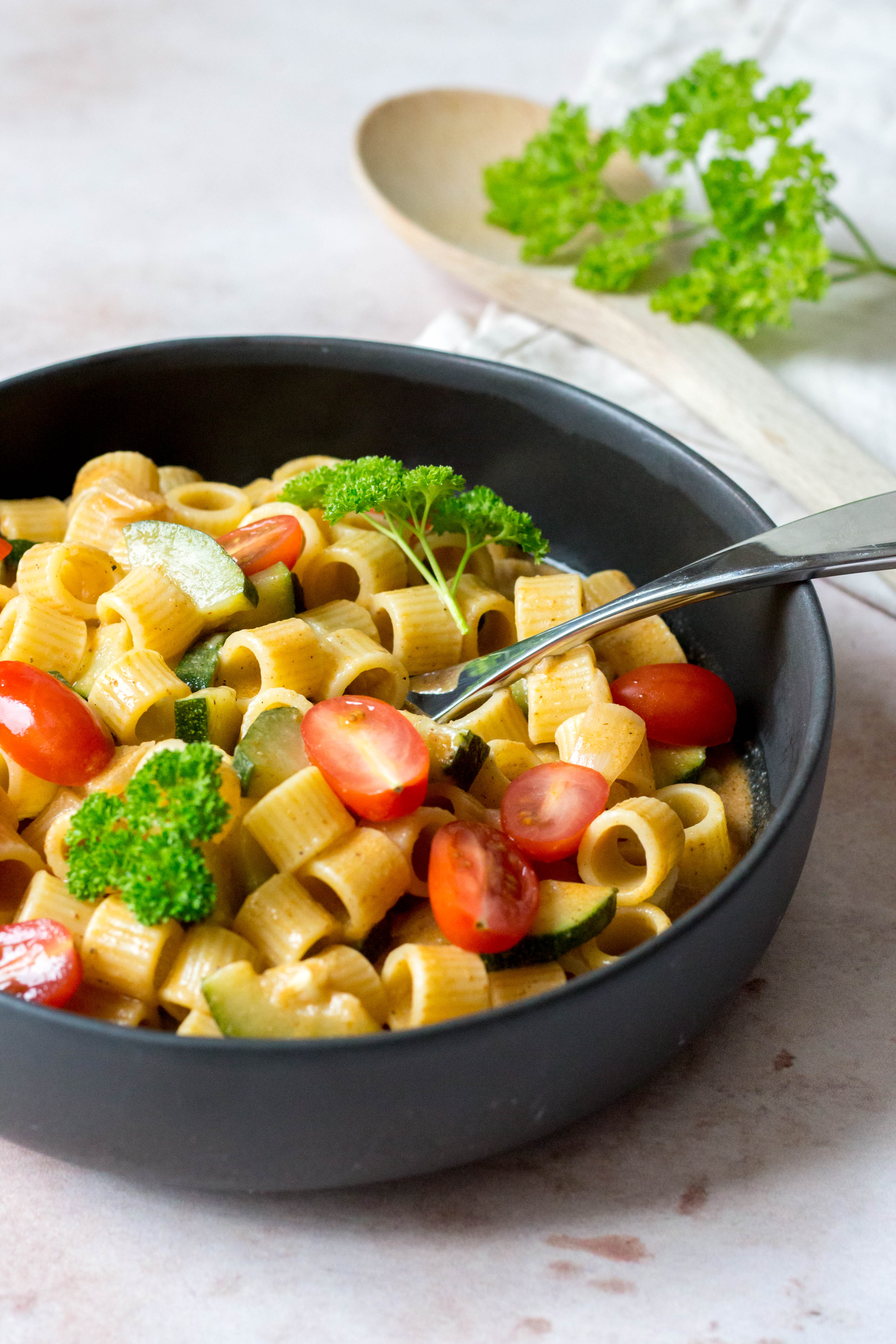 Ik vind curry super lekker. Meestal eet ik curry met rijst of noedels maar met pasta is dat even lekker! Ik heb gekozen voor een kleinere pastasoort met ribbeltjes. Door deze ribbeltjes kan de pasta de saus goed opnemen. De soort die ik gebruikte heet Ditali maar je kan even goed Penne gebruiken. Voor een curry kan je eender welke groenten gebruiken, ik heb courgette en kerstomaten toegevoegd, één van mijn favoriete groenten! De kerstomaten heb ik koud toegevoegd, dit zorgt voor een frisse toets aan het gerecht! Dit is een vegetarisch gerecht maar je kan evengoed kip, scampi of ander lekkers toevoegen.
