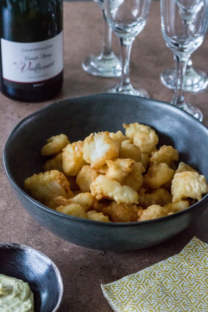 Snij de kabeljauw in blokjes. Kruid met viskruiden. Sop deze één voor één door het beslag en frituur tot ze goudbruin zijn. (Zorg ervoor dat ze niet aan de bodem blijven plakken).