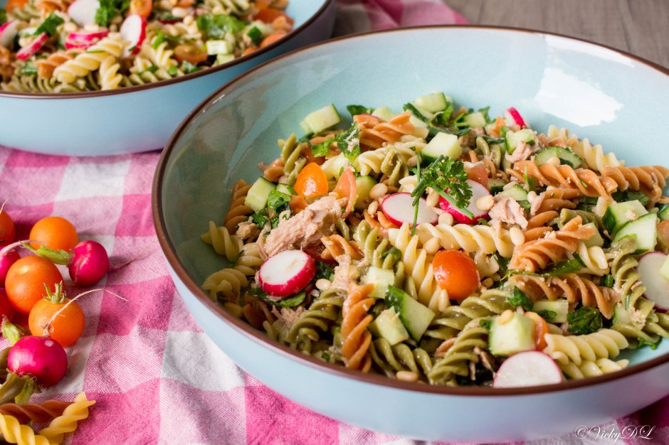 Bij zomers weer hoort een frisse salade! Deze is met pasta, tonijn en heel veel groentjes, super lekker!