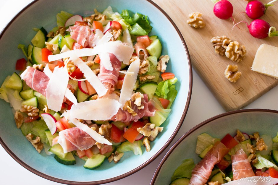 Al eens walnootolie geprobeerd? Een heerlijke olie die je perfect kan gebruiken als dressing in een frisse salade. In dit geval met parmaham en gehakte walnoten. 🙂