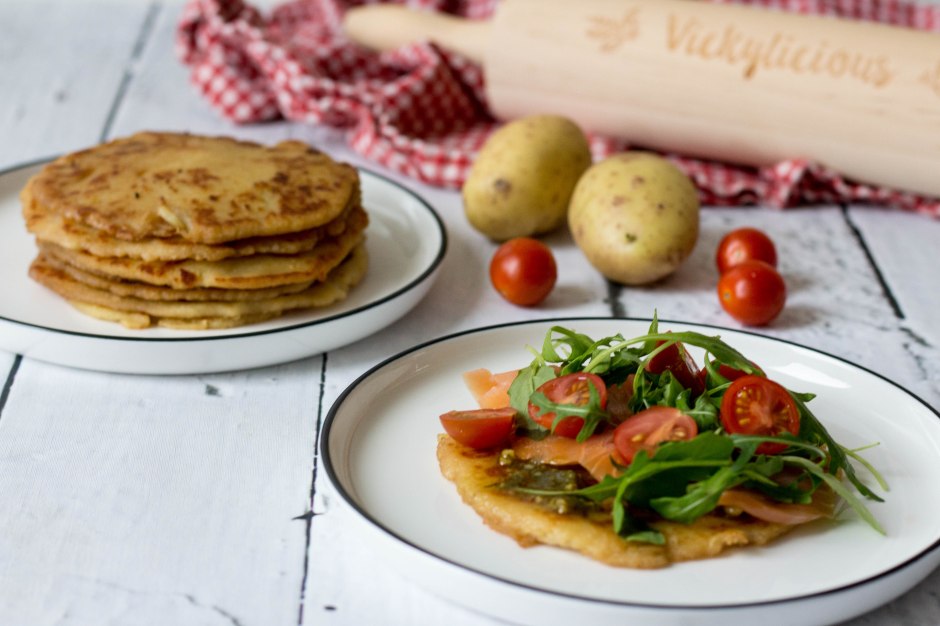 Aardappelpannenkoeken met gerookte zalm en pesto