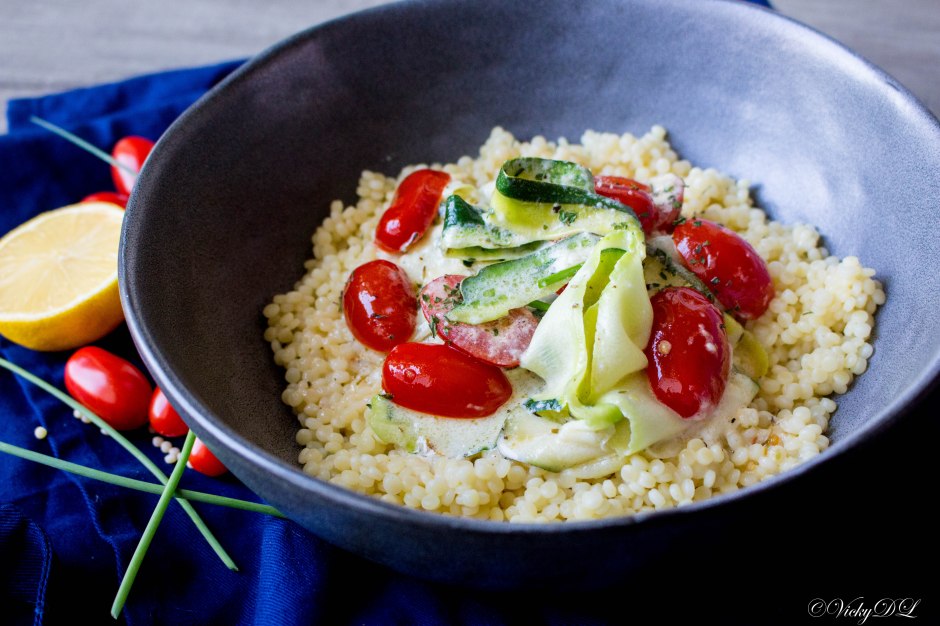 Romige parelcouscous met courgette en kerstomaten