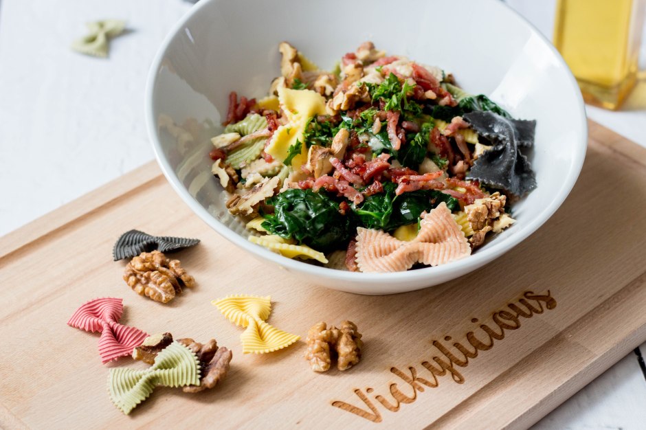 Een lekker bordje pasta kan er altijd wel in in. Deze pasta heet farfalle (of strikjespasta). Deze mooie 4-kleurige variant is van Oil and Vinegar, een merk waar ik grote fan van ben. Voor dit recept koos ik spinazie, spekjes en Parmezaanse kaas. Een lekkere combinatie afgewerkt met walnootolie die dit gerecht helemaal afmaakt!