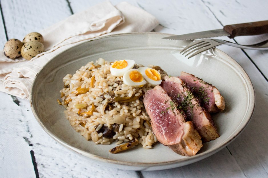 Risotto van paddenstoelen en truffel met eend en kwarteleitjes